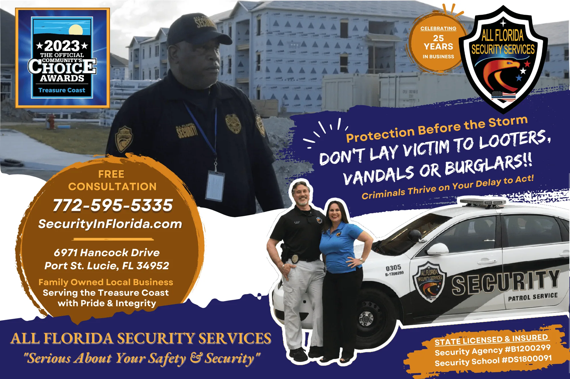 All Florida is celebrating our 27th year in business! We provide high quality security officers, both armed and unarmed on a single site or at multiple locations, short or long terms on the Treasure Coast. The majority of our security officers are former Law Enforcement officers, retired military, and professionals in our industry. All our officers are vetted, trained, and certified before ever entering a security site. As you can tell, we are eager to earn your trust and are very attentive to all our clients needs.