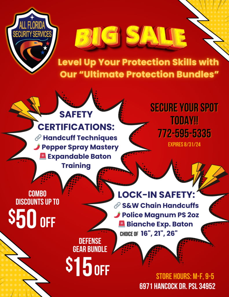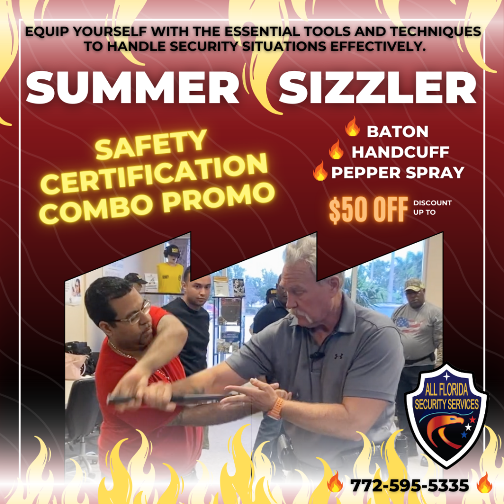 This course teaches you how to safely use defensive tools like handcuffs, pepper spray, expandable batons, and Tasers. You’ll learn proper carrying techniques, legal guidelines, and effective ways to handle different situations. Our experienced instructors provide hands-on practice so you feel confident using these tools responsibly. This training is ideal for security professionals who want to add valuable skills to their resume. Completing this course helps you respond to incidents safely, control conflicts, and protect yourself and others while meeting Florida’s security standards and professional best practices.