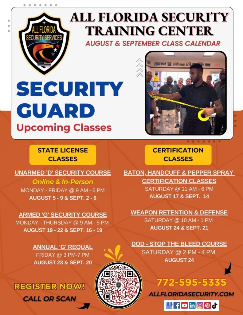 Posted on Dohas passeTrustindex verifies that the original source of the review is Google. Richard is a great instructor and the course was super fun and well informed. I’m definitely coming back for another course!Posted on Joseph RangelTrustindex verifies that the original source of the review is Google. I have been a professional weapons handler for over 25 years. I was impressed by Rich's professionalism and respect for the experience of the students in the room. In fact...I was impressed enough that I'll be bringing my family 30 minutes farther than a closer facility to make sure they are trained here, by people I trust.Posted on Sieg ATrustindex verifies that the original source of the review is Google. Excellent and comprehensive training. A great organization with people friendly staff. Enjoy working with a great team and great leadership that set a high standard of performance. Would highly recommend All Florida as a place to work or a company to connect with for the variety of services we are able to provide for you!Posted on Tim PurcellTrustindex verifies that the original source of the review is Google. All Florida is awesome. I took the D & G classes and Richard Wilson and Chief Stein are fantastic. Very thorough and clear instructions made each class enjoyable. They have a ton of information and bring the classroom atmosphere to a level that all students can relate. It was a pleasure to work with them and I know I’ll be back! Thank you AFSS!Posted on keenan kashaleonTrustindex verifies that the original source of the review is Google. Great school and worth the investment in yourself!🦾Posted on Sydney “Syd” DennisTrustindex verifies that the original source of the review is Google. The course was highly informative and easily digestible. I would highly recommend this company to anyone who would like to enter the security guard workforce.Posted on Vincent FarinaTrustindex verifies that the original source of the review is Google. I took the unarmed class D security course with All Florida the instructor was great very knowledgeable and professional, class was very informative I recommend it to all, I signed up for the G course nextPosted on Bruce AbernethyTrustindex verifies that the original source of the review is Google. Very professional in all respects. Great communication throughout the engagement. Highly recommend Richard and his team!