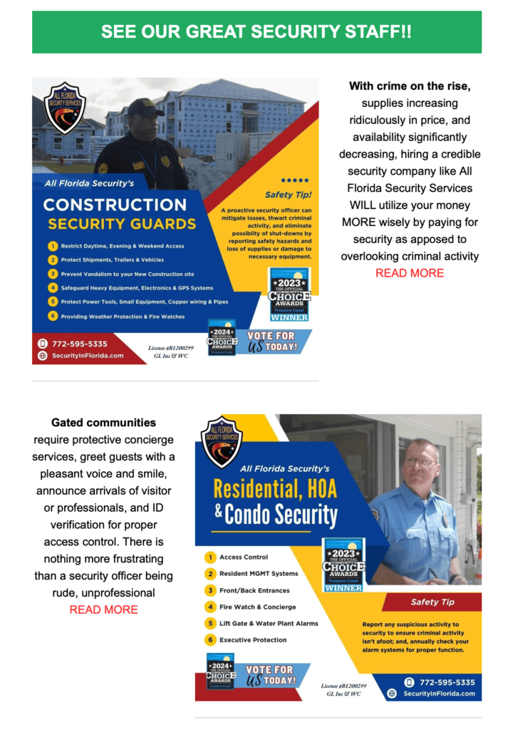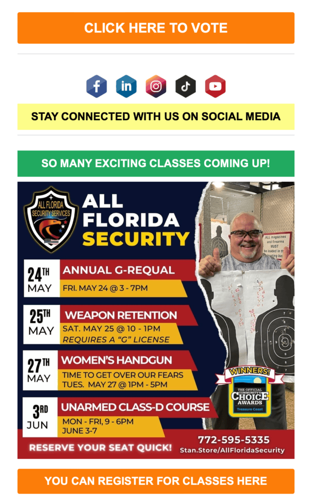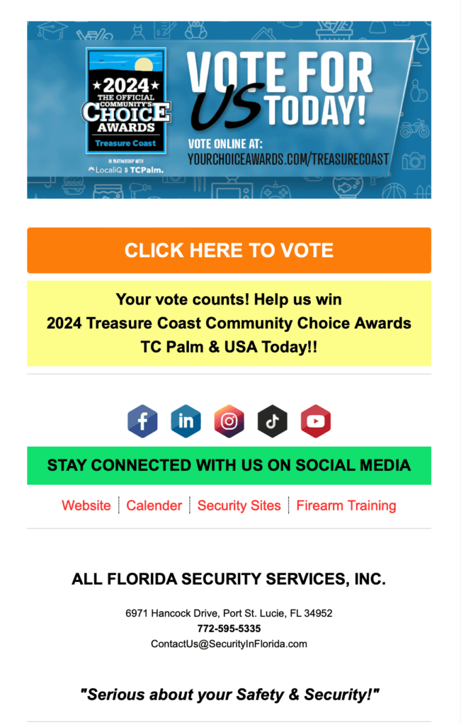 All Florida Security Services WON the 2023 USA Today & TC Palm Community Choice Contest for being “The BEST Security Company on the Treasure Coast” and now we are defending our title for 2024! Check out all the ways in which All Florida Security provides Professional Security Services to our communities; Port St. Lucie, Vero Beach, and Stuart, the Treasure Coast and our great state of Florida.