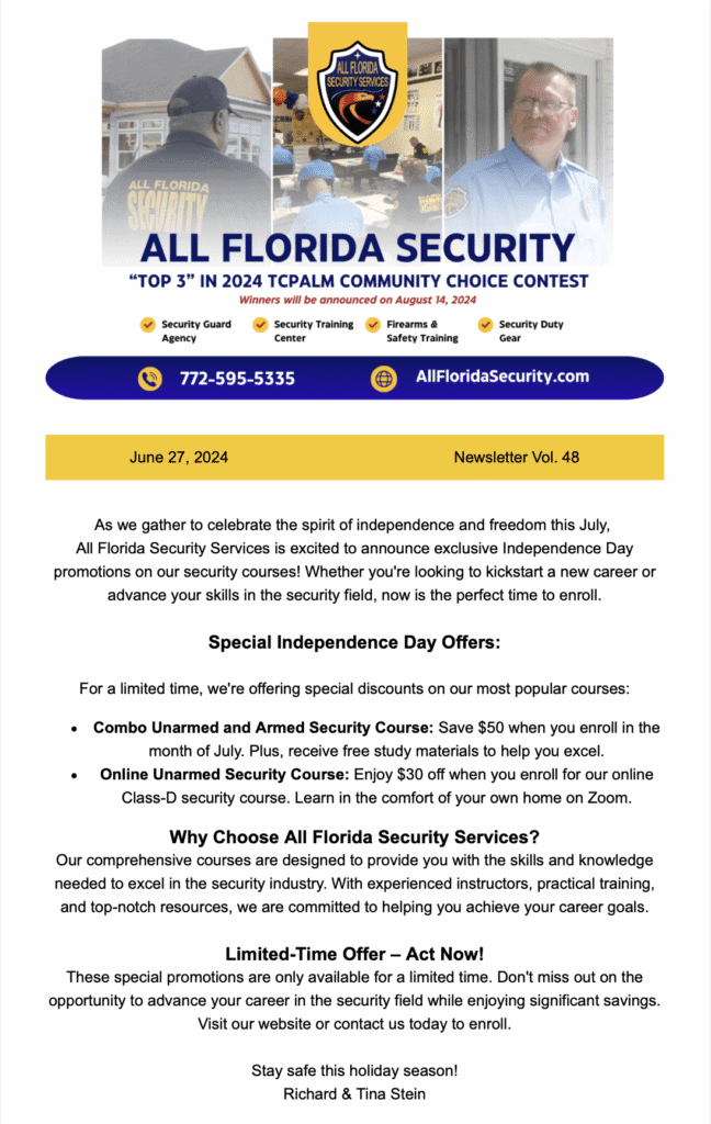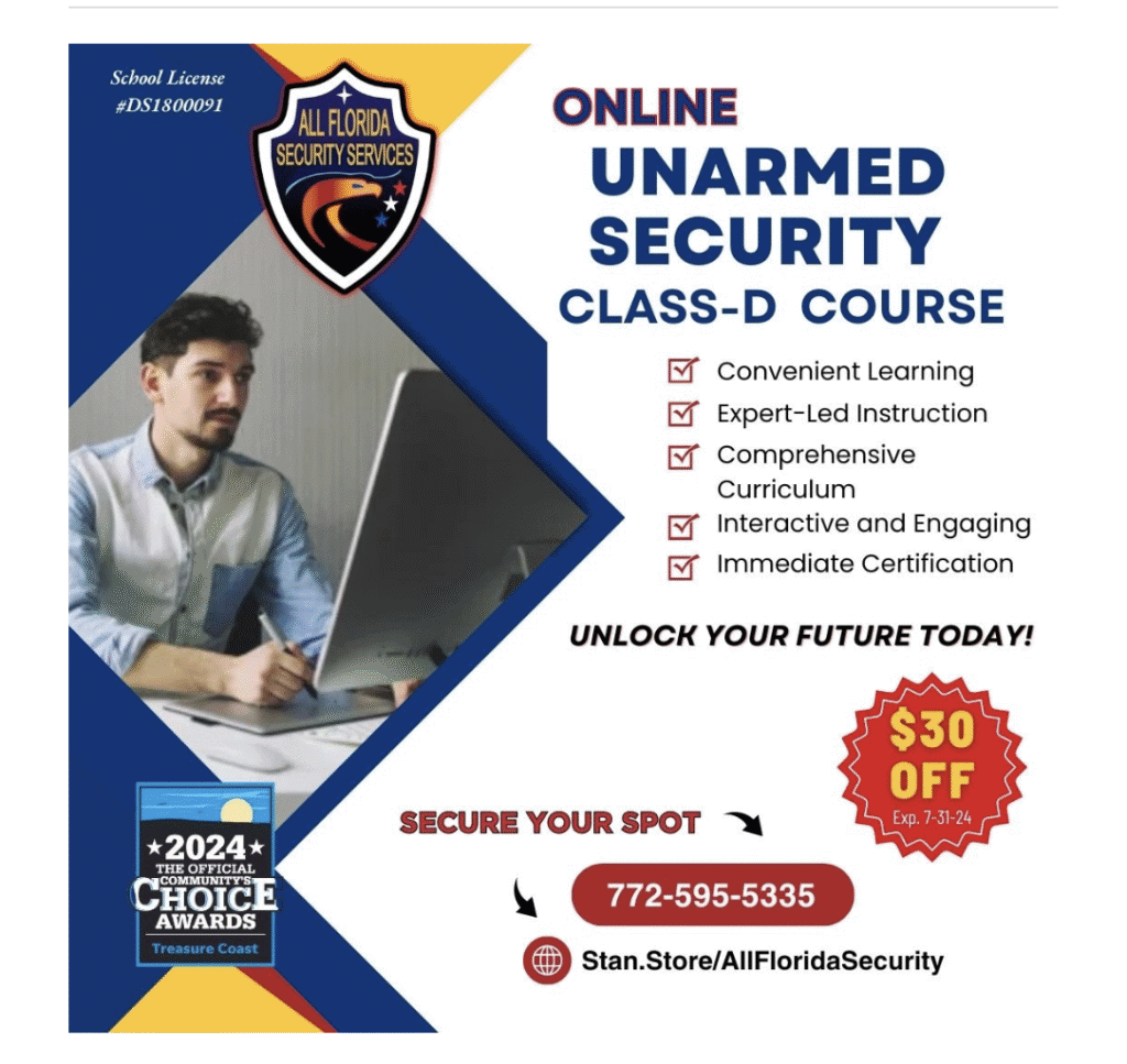 All Florida Security Services, is the WINNER of “The BEST Security Company on the Treasure Coast” for the Community Choice Award by USA Today and TC Palm, TWO YEARS IN A ROW 2023 & 2024!